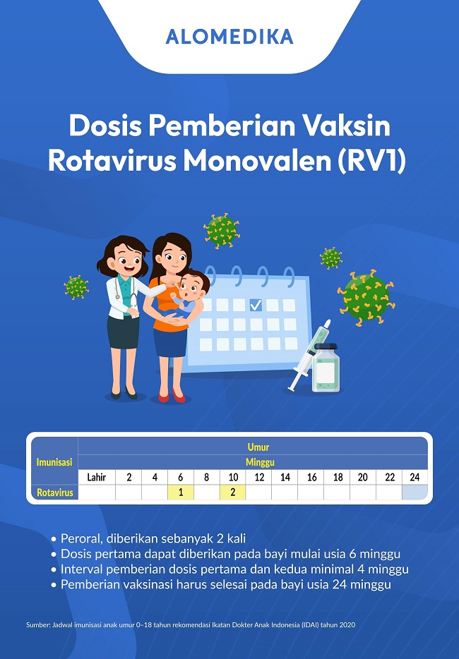 Untuk vaksin RV1, vaksin diberikan 2 kali dengan jarak 4 minggu antar dosis. Dosis yang diberikan adalah 1 mL. Jadwal pemberian yang dianjurkan adalah saat usia 2 bulan dan 4 bulan. Usia minimal pemberian adalah 6 minggu dan usia maksimal pemberian adalah 24 minggu.[2,4,9,21]