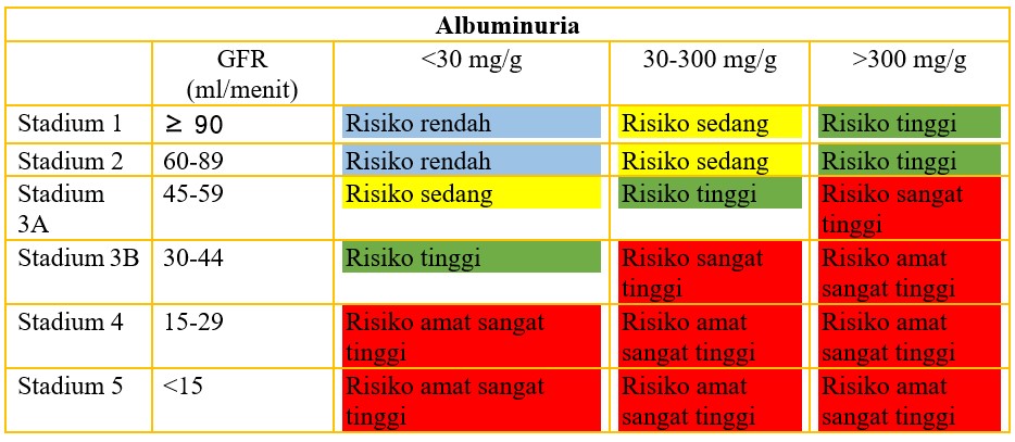 | Stadium 1 | ≥ 90 | Kerusakan ginjal dengan GFR normal | Belum terdapat komplikasi |