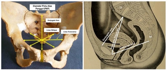 PAP dikatakan sempit jika jarak konjugata vera <10 cm atau diameter transversal PAP (tegak lurus konjugata vera) <12 cm. Konjugata vera akan dilalui oleh diameter biparietal janin dengan ukuran ±9,5-10 cm. Ukuran konjugata vera yang <10 cm akan mempersulit janin untuk lewat.[5]